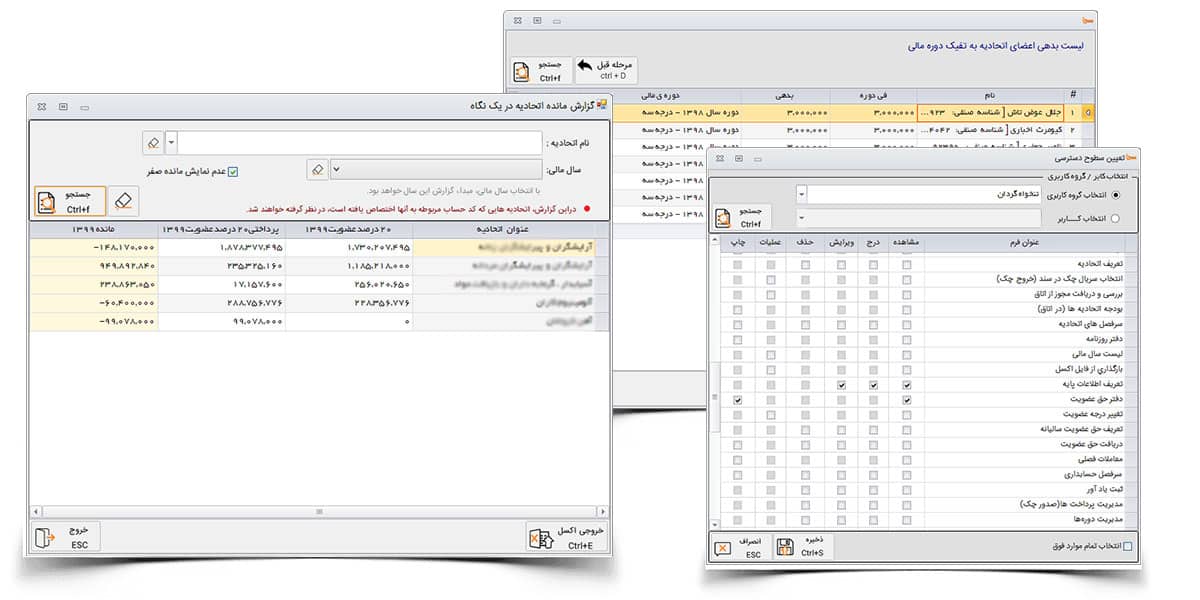1- امکان ثبت تمامی درآمدها،هزینه ها و اسناد مالی اتحادیه های مختلف به تفکیک بر روی یک نرم افزار