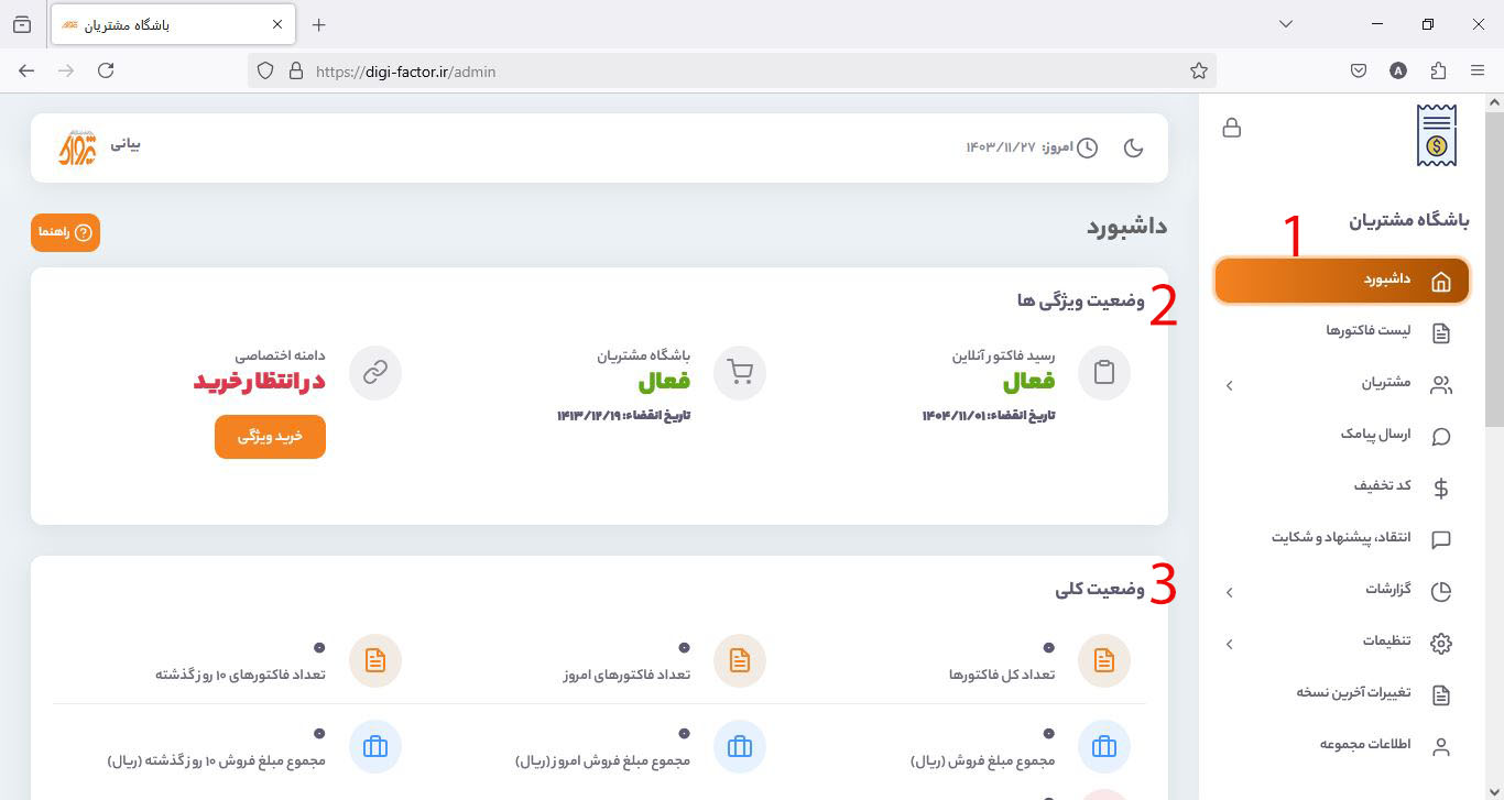 پس از ورود به سامانه رسید فاکتور آنلاین مشتری ، همانطور که ملاحظه می کنید صفحه داشبورد به قسمت های مختلفی تقسیم شده که به توضیح تک تک موارد می پردازیم. بعد توضیح مختصر در مورد قسمت های این صفحه بپردازید.