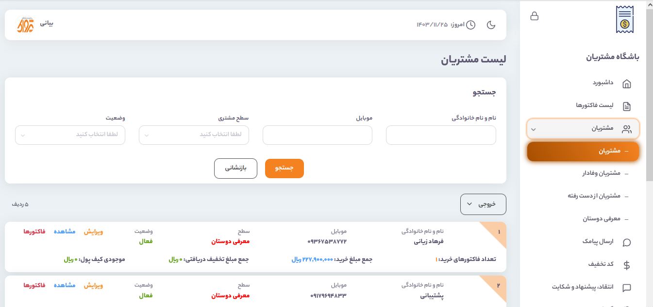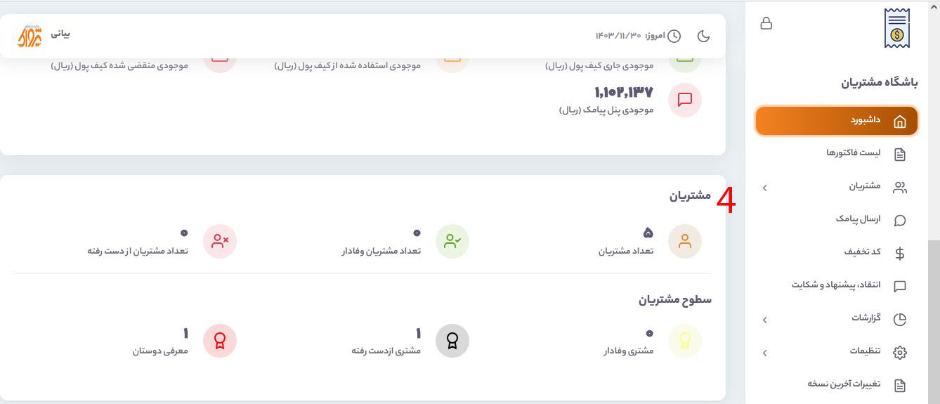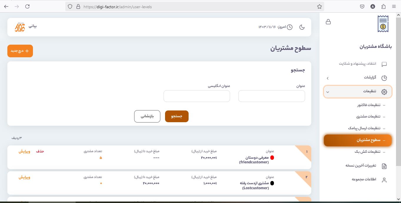 در این بخش از شکل زیر سمت راست منو ، گزینه تنظیمات / سطوح مشتریان میتوانید مشتریان خود را بر اساس معیارهای مختلف دستهبندی و مدیریت کنید. این دسته بندی ها کمک میکنند تا استراتژی های بازاریابی و خدماترسانی خود را به طور مؤثرتری برنامهریزی کنید. گزینه هایی مانند مشتریان وفادار، مشتریان از دست رفته و دعوت دوستان وجود دارد.