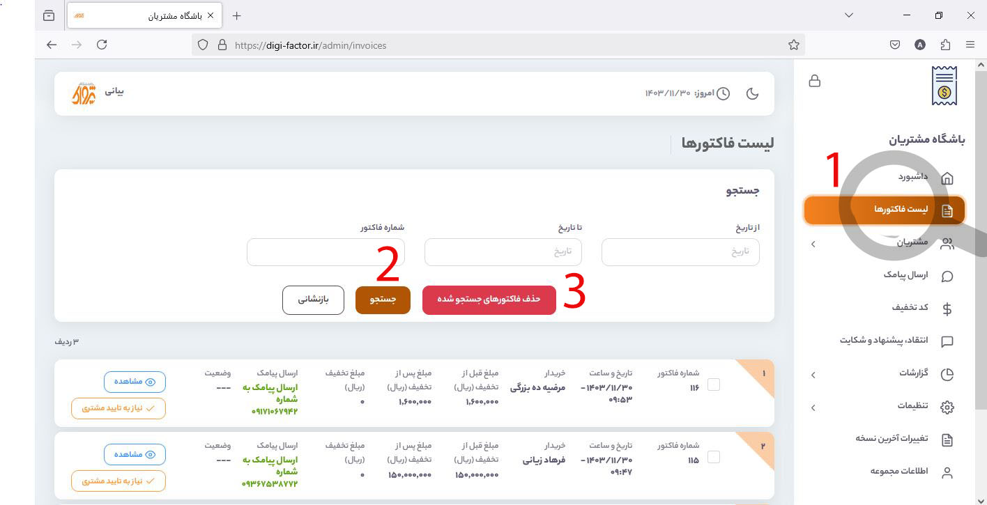 - مطابق با شکل زیر سمت راست در مرحله یک، گزینه “لیست فاکتور ها “ را انتخاب کرده و فاکتور های ثبت شده در نرم افزار توسط کاربر قابل مشاهده می باشد. در مرحله دو دکمه “جستجو” برای پیدا کردن فاکتوری خاص با فیلتر های آن می باشد.( توجه داشته باشید از فیلترهای از تاریخ، تا تاریخ و شماره فاکتور می توان فرآیند جستجو را انجام دهید.) پس از فشردن دکمه جستجو لیست فاکتور های ثبت شده توسط کاربر در نرم افزار، قابل مشاهده می باشد .