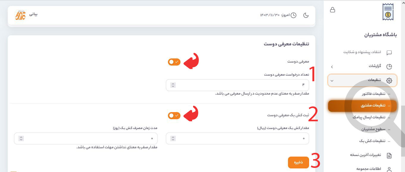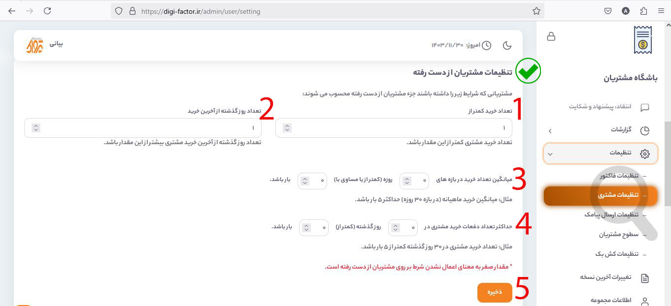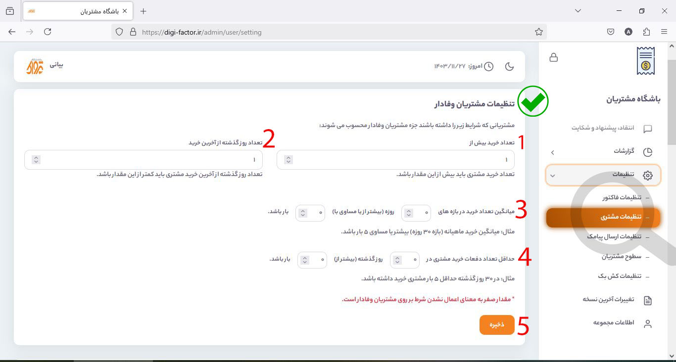 - اولین مورد بخش تنظیمات مشتری در سمت چپ، مربوط به “مشتریان وفادار” است. در این قسمت، شما باید تعداد خرید های لازم برای دستیابی به وضعیت وفاداری را بر اساس معیارهای کسب وکار خود وارد کنید. پس از وارد کردن تعداد مورد نظر، در مراحل نشان داده شده شکل زیر روی دکمهی “ذخیره ” فشار دهید تا تغییرات اعمال شوند.