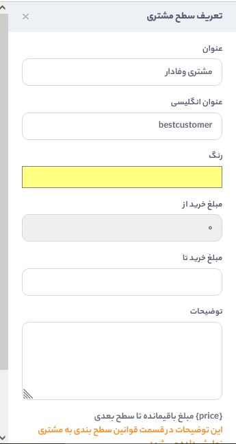 در این قسمت، با انتخاب دکمهای که در شکل فوق نشان داده شده است، میتوانید سطح مشتری را تعریف کنید. این کار معمولاً به شما امکان میدهد تا مشتریان خود را بر اساس معیارهای مختلف (مانند رنگ، مبلغ خرید از و مبلغ خرید تا و غیره) دستهبندی کنید. این دسته بندی میتواند به شما در ارائه خدمات بهتر، تخفیف های ویژه یا برنامه های وفاداری کمک کند.
