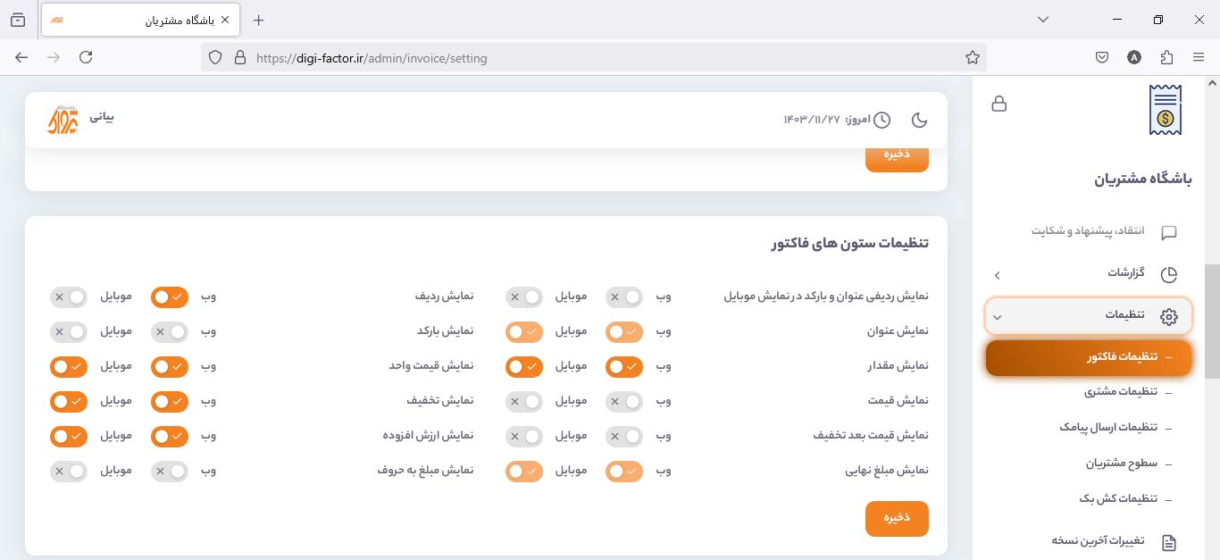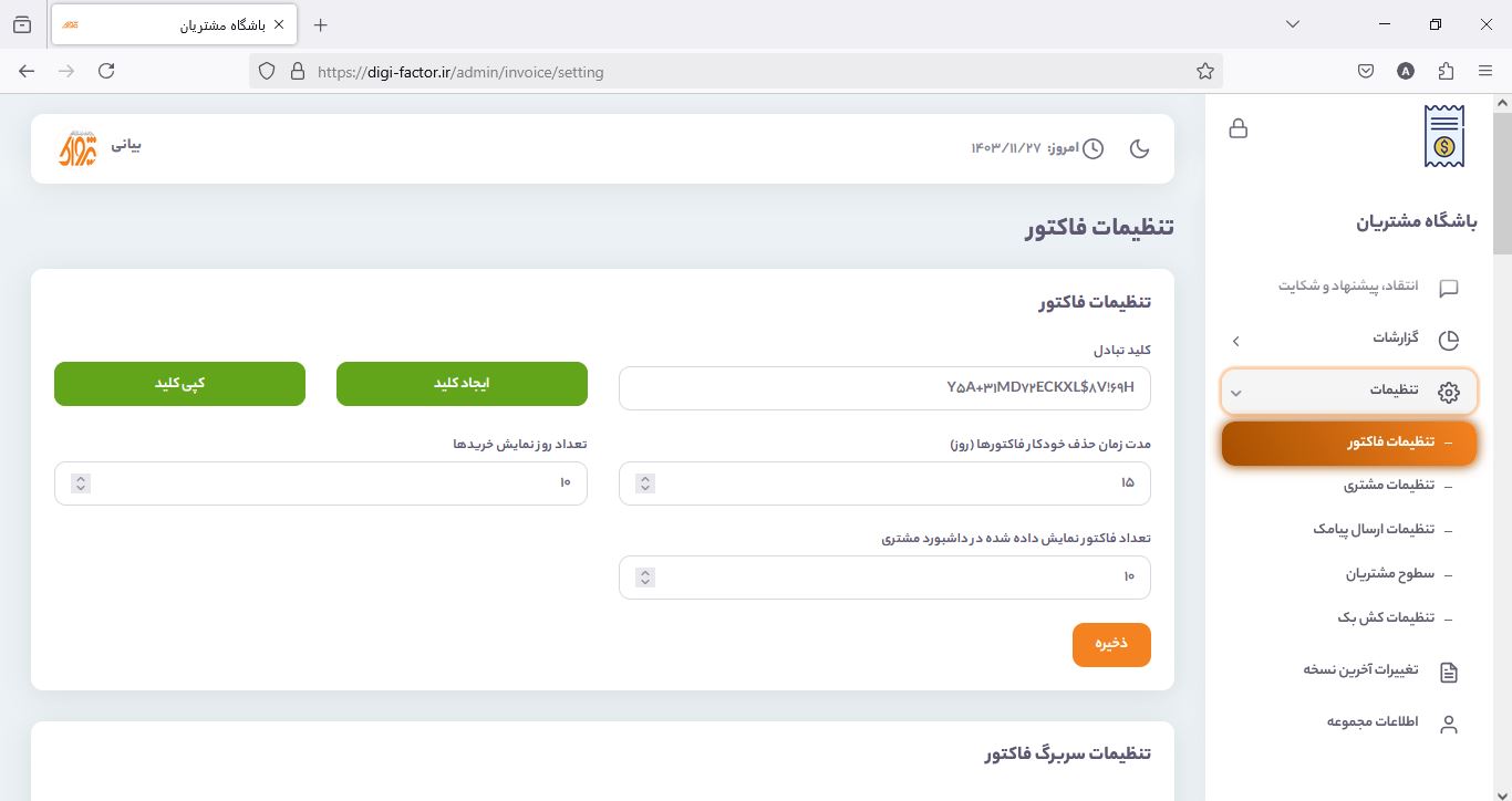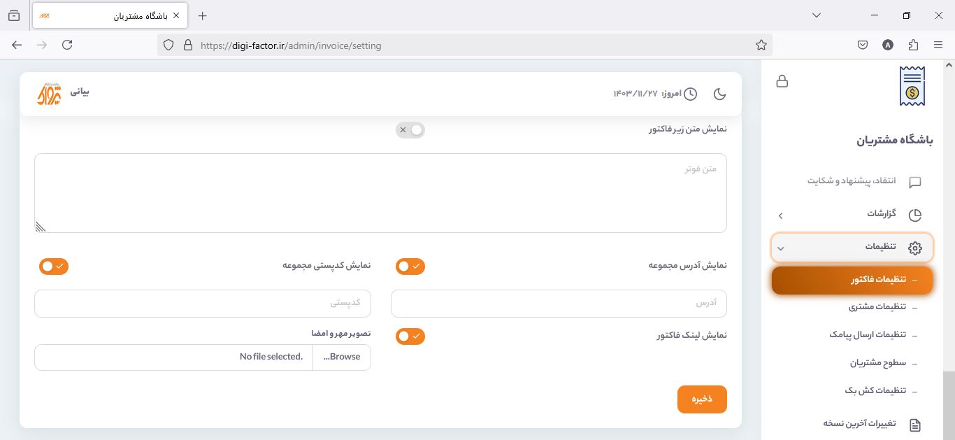 از دیگر تنظیمات فاکتورها در شکل فوق، می توانید تعداد روز نمایش خریدها را انجام دهید که ابتدا، تعداد روزهایی که خرید ها در داشبورد نمایش داده میشوند مشخص کنید. سپس در آخرین گزینه، تعداد فاکتورهایی که می خواهید در داشبورد مشتری نمایش داده شود وارد نمایید. در آخر جهت اعمال تنظیمات دکمه “ذخیره” را فشار دهید .