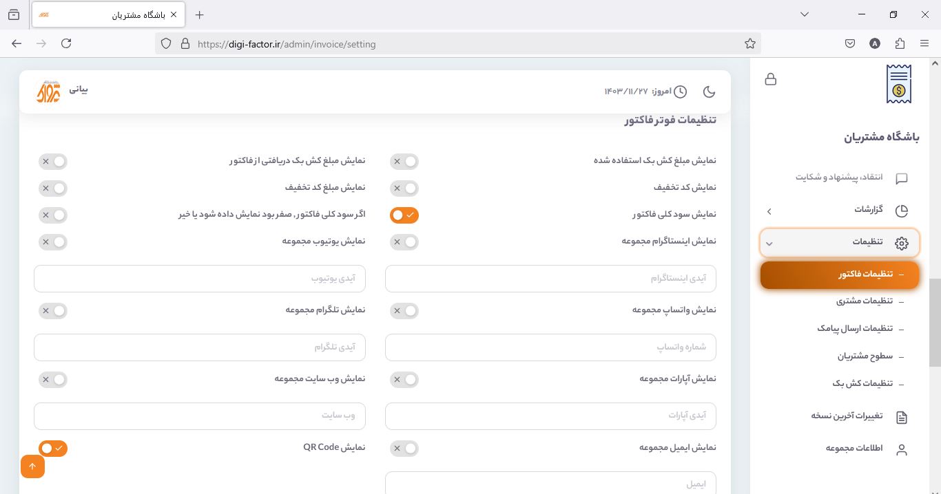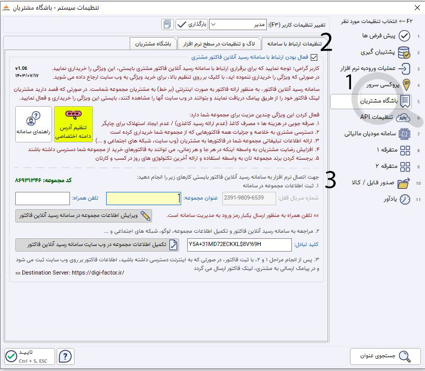 ” تنظیمات ارتباط با سامانه ” انتخاب کرده و گزینه ” فعال بودن ارتباط با سامانه آنلاین فاکتور مشتری” را تیک بزنید.