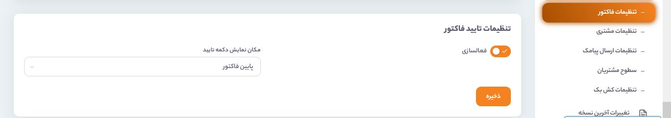 در این بخش جهت تایید فاکتور، بایستی تنظیمات آن از طریق دکمه فعالسازی کنید. همچنین میتوانید مکان نمایش دکمه تأیید را مشخص کنید.