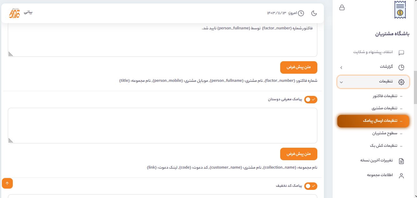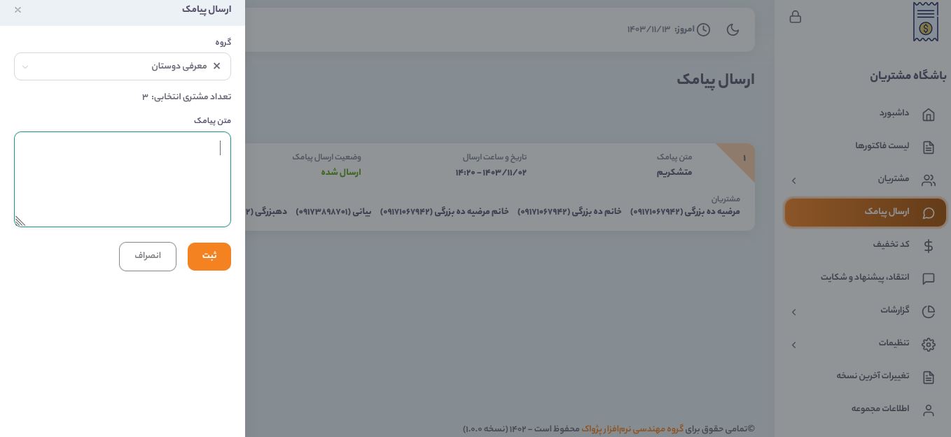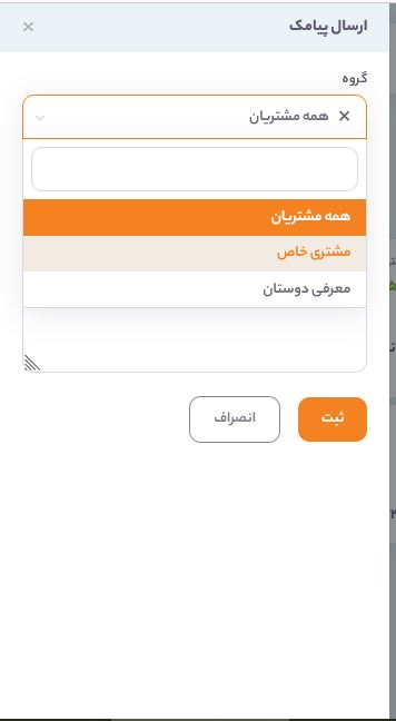 - تمامی مشتریان: اگر میخواهید پیامک را به تمامی مشتریان ارسال کنید، این گزینه را انتخاب نمایید.