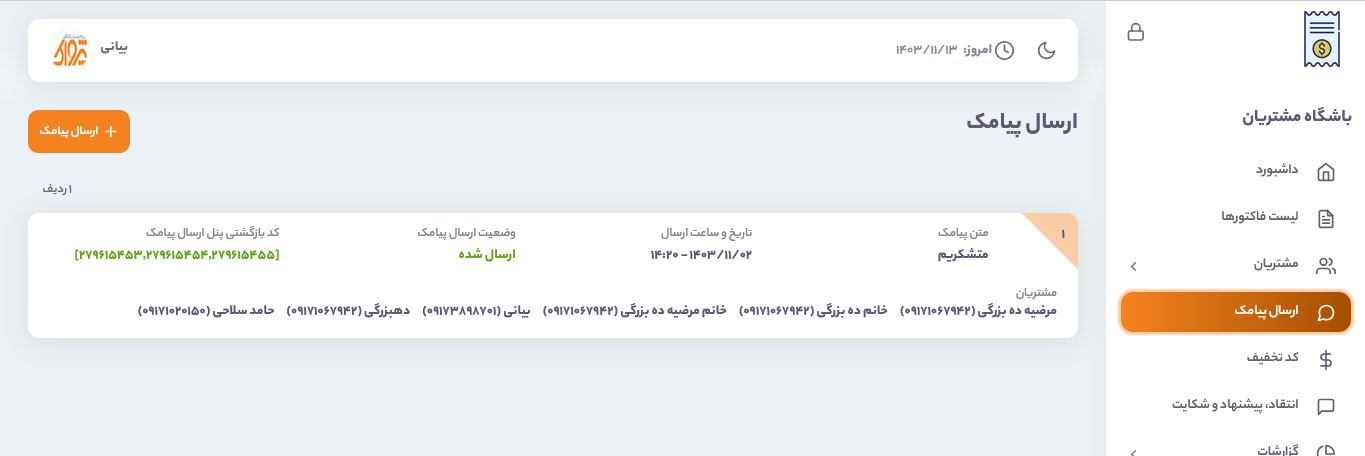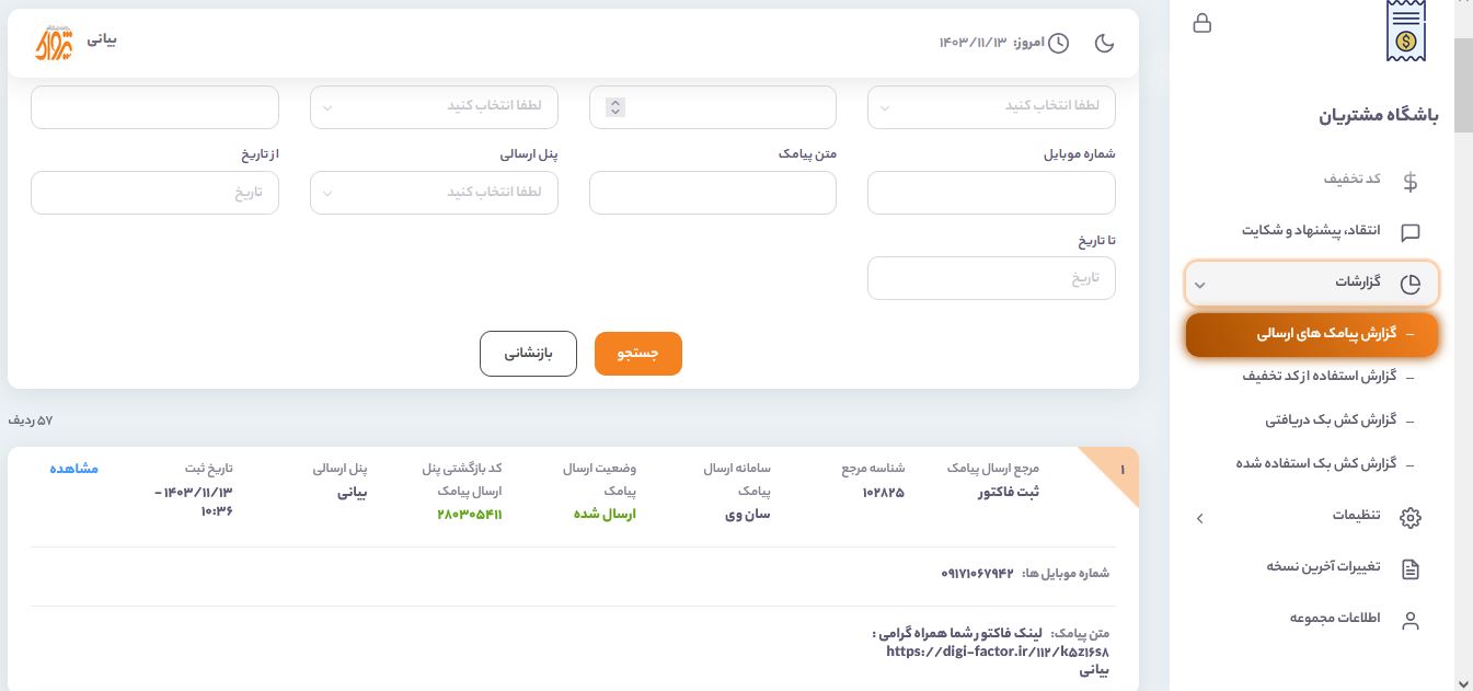 این گزارش شامل اطلاعاتی درباره پیامک هایی است که توسط باشگاه مشتریان ارسال شده است. میتوانید تاریخ ثبت، سامانه ارسال پیامک و وضعیت ارسال پیامک و غیره را در این بخش مشاهده کنید.