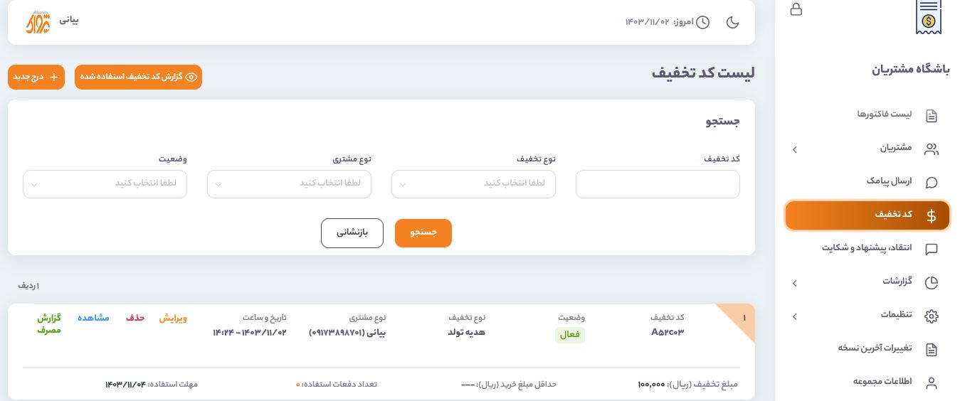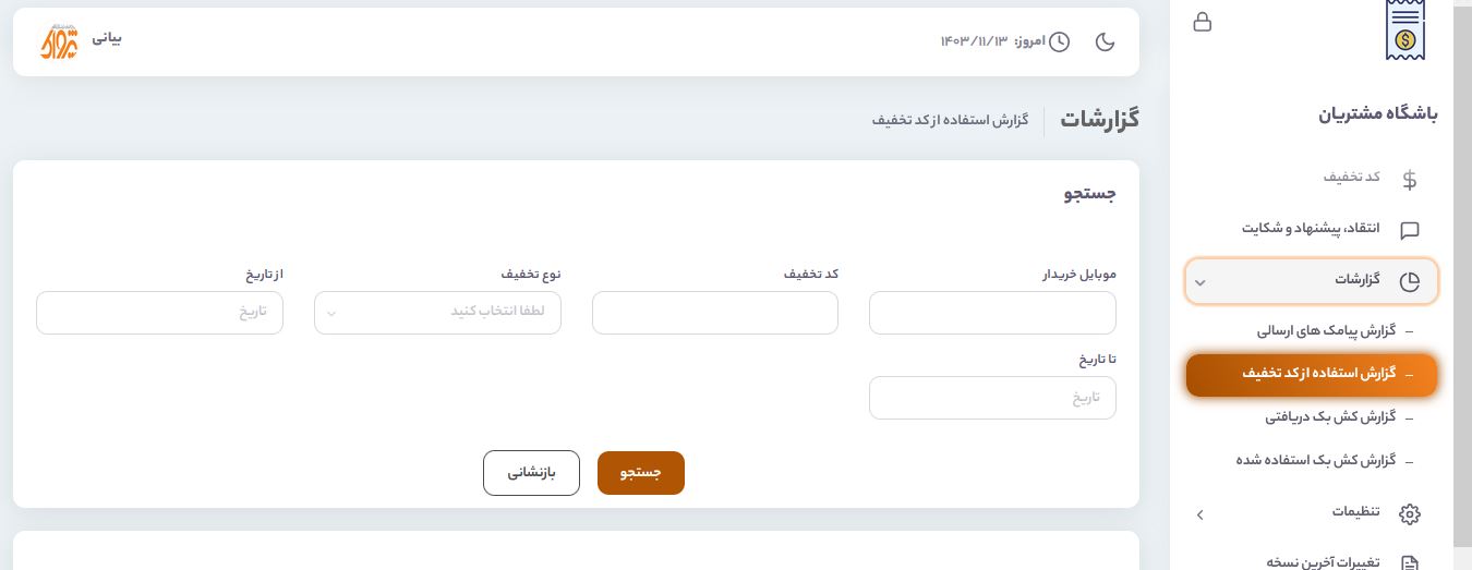 در این بخش، اطلاعات مربوط به کد های تخفیفی که توسط اعضا استفاده شده است، نمایش داده میشود. این گزارش شامل تاریخ ، نوع تخفیف و غیره میباشد.