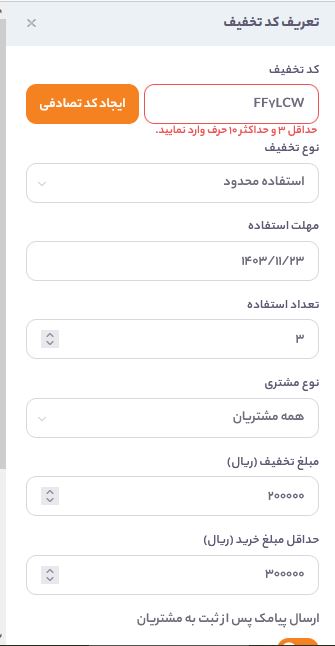 - وارد کردن مقادیر: مقادیر مورد نظر خود را در فیلدهای مربوطه وارد کنید. به عنوان مثال، اگر میخواهید گزارش کدهای تخفیف استفاده شده در یک بازه زمانی خاص مشاهده کنید، از تاریخ و تا تاریخ را وارد کنید.