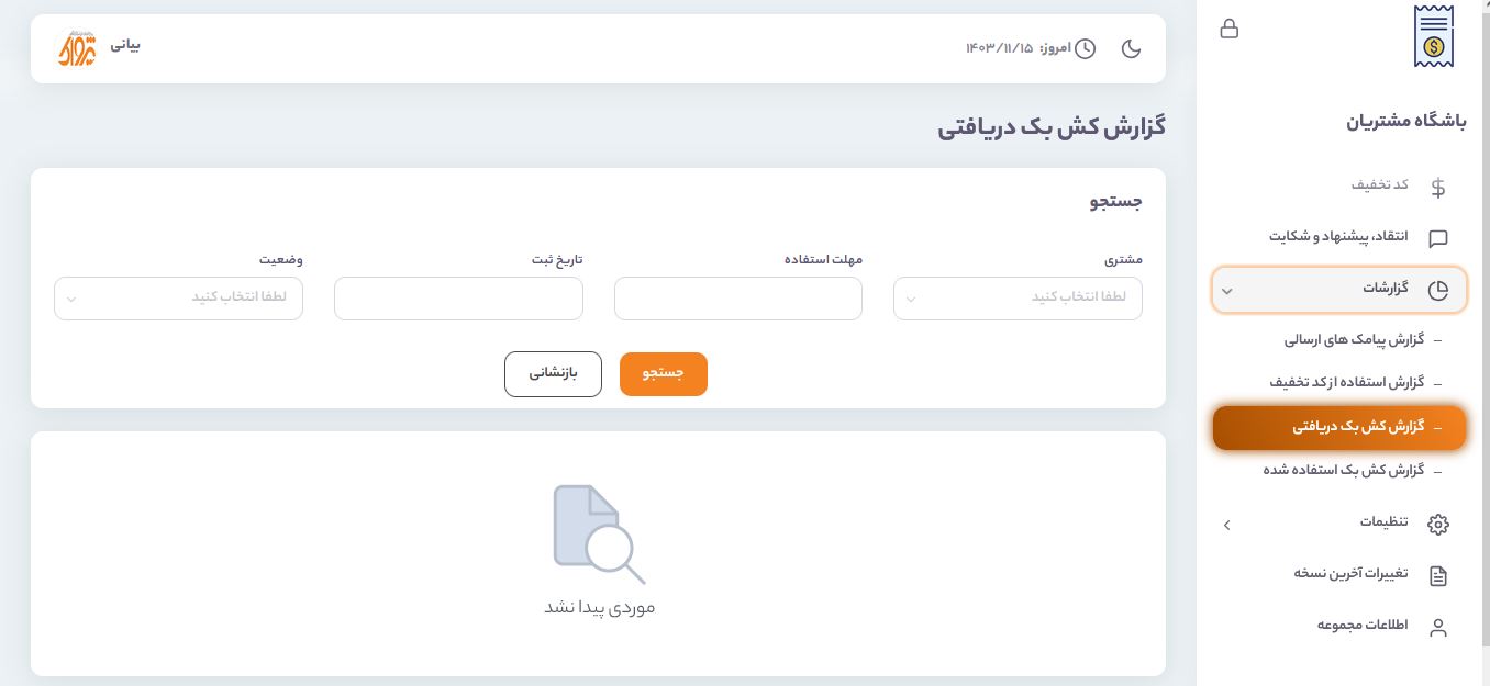 این گزارش نشاندهنده مبالغ برگشت پول نقد است که اعضا به عنوان پاداش یا بازگشت وجه دریافت کردهاند. اطلاعاتی مانند تاریخ ثبت، مهلت استفاده ، مشتری و وضعیت در این بخش قابل مشاهده است.