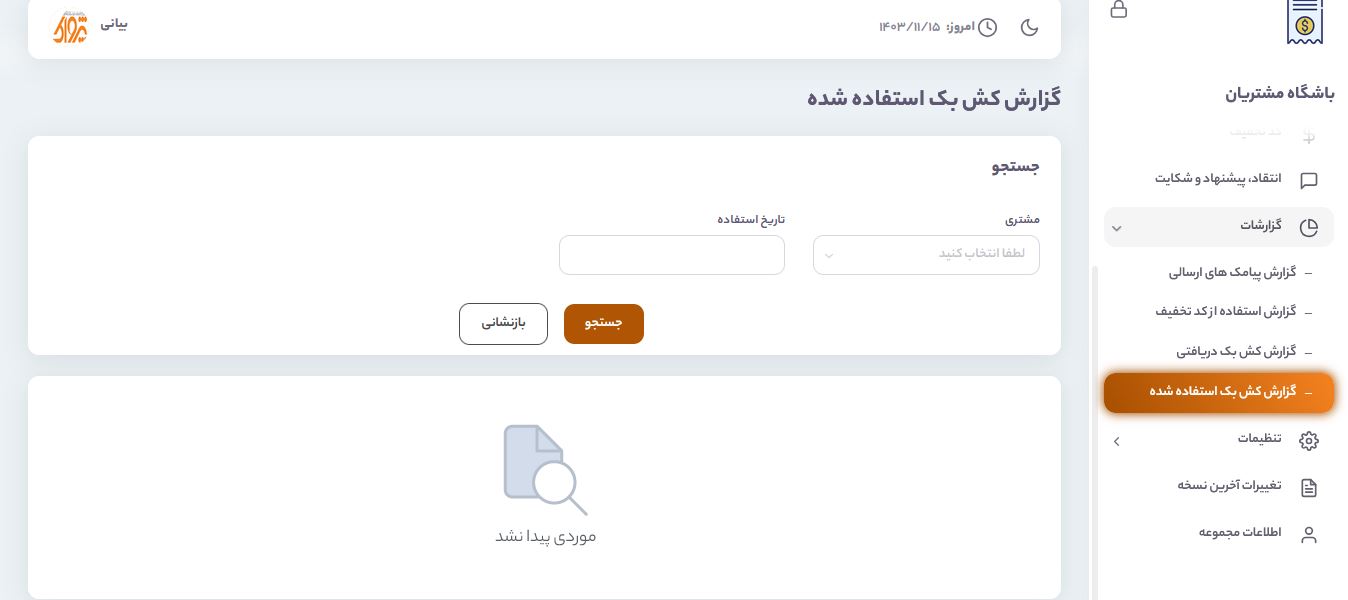 در این بخش، اعضا میتوانند گزارشی از مبالغ برگشت پول نقد که استفاده کردهاند مشاهده کنند. این گزارش شامل تاریخ استفاده، مشتری که برگشت پول برای آن استفاده شده است، میباشد.
