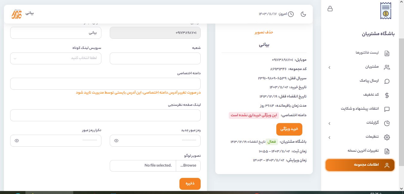 در این بخش از منوی سمت راست شکل زیر، گزینهی «تنظیمات / تنظیمات مشتری» را انتخاب کنید.