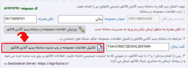 - پس از ارسال کلید تبادل به صورت اتوماتیک، مطابق با شکل زیر دکمه ” تکمیل اطلاعات مجموعه در وب سایت سامانه رسید آنلاین فاکتور” انتخاب کنید .