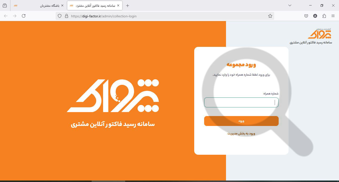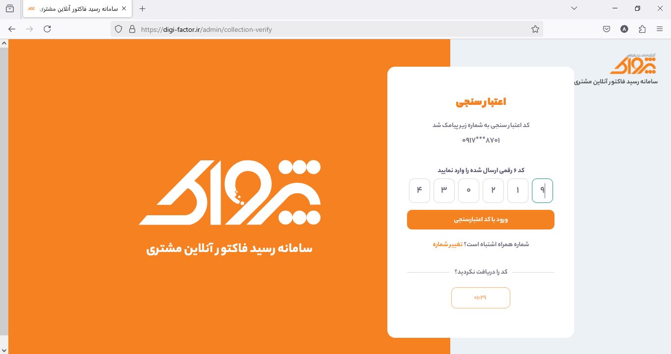 - پس از فشردن دکمه “تکمیل اطلاعات مجموعه در وب سایت سامانه رسید آنلاین فاکتور”، صفحه ای برای ورود به سامانه رسید فاکتور آنلاین مشتری باز میشود. در این صفحه، باید شماره همراه خود را وارد کرده و سپس دکمه “ورود” را فشار دهید تا وارد سامانه شوید. در اولین ورود، کد اعتبار سنجی برای شما پیامک می شود ولی در دفعات بعد ورود نیازی به این کد نیست .این مراحل به شما امکان دسترسی به بخشهای مختلف سامانه ، مدیریت فاکتورها و اطلاعات مربوطه را میدهد.
